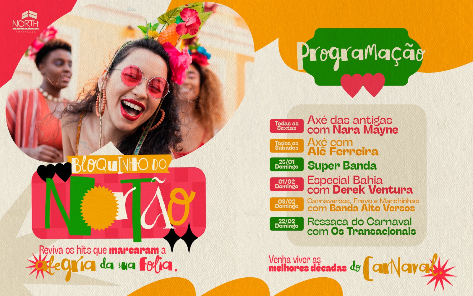 Aos domingos, o Quintal do Nortão recebe atrações especiais ao longo do período pré-carnavalesco. No dia 25 de janeiro, a animação fica por conta da Super Banda. Já no dia 1º de fevereiro, o público confere o Especial Bahia com Derek Ventura. No dia 8 de fevereiro, a programação traz Carnaversos, Frevo e Marchinhas com a Banda Alto Versos, resgatando a essência das tradicionais festas de carnaval. Encerrando a agenda, no dia 22 de fevereiro, a Ressaca do Carnaval será comandada pela banda Os Transacionais, prolongando o clima de folia. As inscrições devem ser feitas através do aplicativo do shopping.